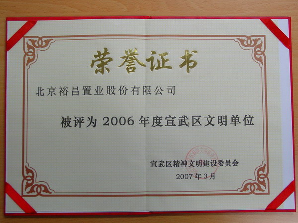 北京裕昌置業(yè)股份有限公司被評為2006年度宣武區(qū)文明單位
