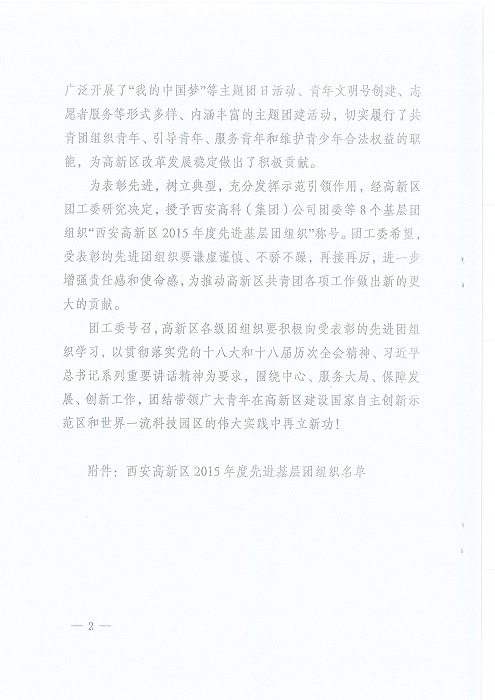 熱烈祝賀我司團支部被評為西安高新區(qū)2015年度“先進基層團組織”