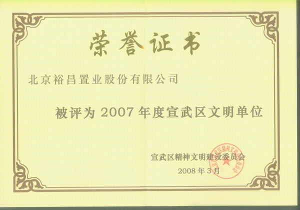 裕昌置業(yè)被評為2007年度宣武區(qū)文明單位