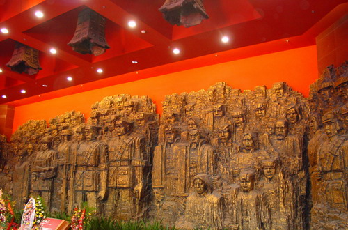 進(jìn)入展館的序廳,迎面是一座長18米、高5米的大型鑄銅浮雕“把我們的血肉鑄成我們新的長城”,左右兩側(cè)墻壁上,分別鑲著《義勇軍進(jìn)行曲》和《八路軍進(jìn)行曲》的曲譜,頂部由15個(gè)方形藻井組成,懸掛著8口方形古鐘,象征著八年抗戰(zhàn),蘊(yùn)意著中國人民抵御侵略的警鐘長鳴。