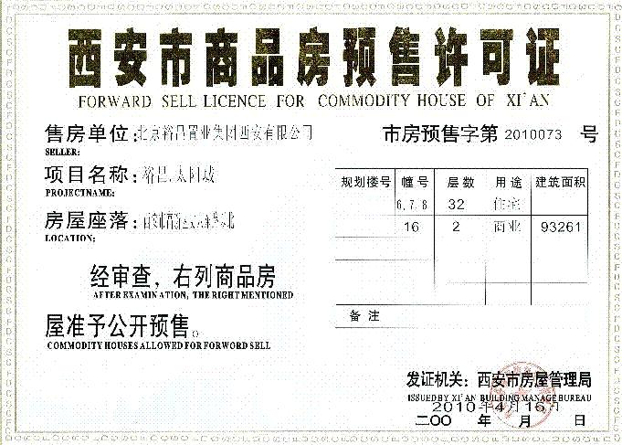 2010年4月19日,我公司裕昌?太陽(yáng)城項(xiàng)目二期已順利取得《商品房預(yù)售許可證》,為日后的銷售工作奠定了強(qiáng)有力的基礎(chǔ)。