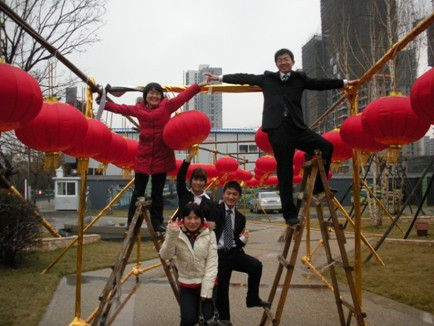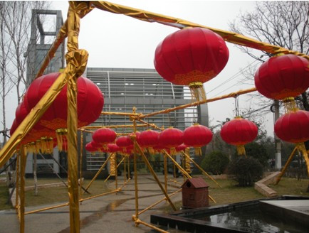 天,開始淅淅瀝瀝地下起了小雨,但絲毫沒有影響大家干活的熱情。金燦燦的綢布到了以后,所有人都出動了,連廚房的汪師傅也不例外,貢獻出他那把鋒利的菜刀,協(xié)助我們將綢布分段。沿著工程部安裝電線和燈泡的線路,我們用綢布將橫架、鐵絲和電線全都包裹起來,讓金色和紅色成為今年春節(jié)的主題。劉妍從設計院回來,一下車就投入到給橫架裹綢布的戰(zhàn)斗中來……