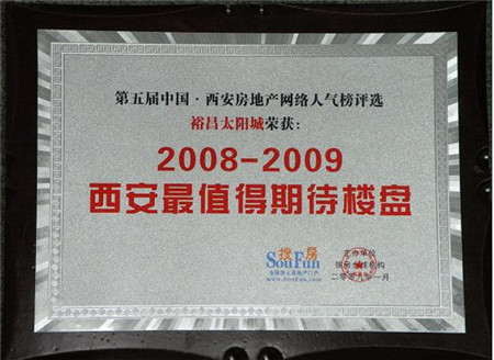 2009年2月15日,西安搜房網(wǎng)為裕昌?太陽(yáng)城項(xiàng)目頒發(fā)西安地產(chǎn)網(wǎng)絡(luò)人氣榜2008~2009年最值得期待樓盤(pán)獎(jiǎng)。